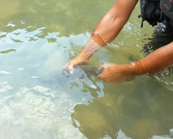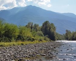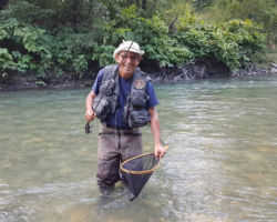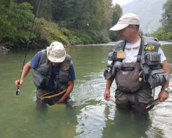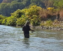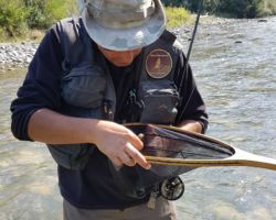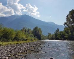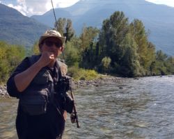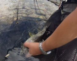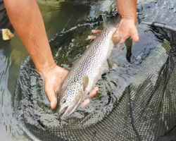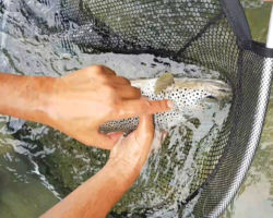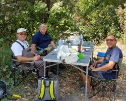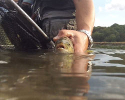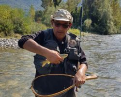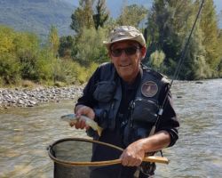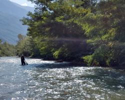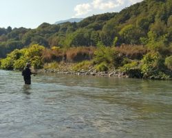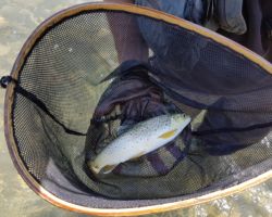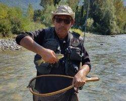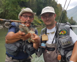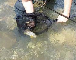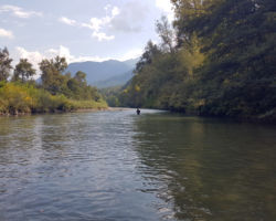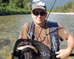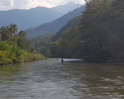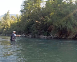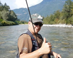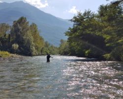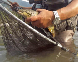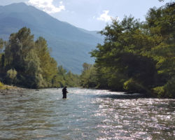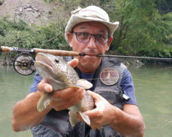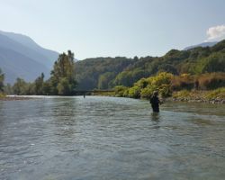 Au départ nous devions faire notre séjour sur la haute rivière d’Ain à Champagnole (déjà annulé au mois de mai à cause du niveau d’eau trop important) et là parce que le niveau d’eau étaient trop bas …. des poissards, pas de chance quand même. Donc Stéph nous propose de nous faire découvrir, l’Arly en Savoie à Albertville plus précisément. Une fois sur place nous avons découvert une rivière bien grise, trop grise pour pêcher. Nous avons décidé avec Pat07, Stéph et Mika de nous reporter sur l’Isère mais 4 km en amont de notre point de départ. L’Isère que je connais très bien et que je retrouve bien plus belle et sauvage que celle qui passe dans mon village d’enfance, Pont de l’Isère à 180 km en aval de ce coin magnifique. Il est 8h30 démarrage de la première session en deux groupes, la rivière est teintée et des herbes flottes dans les courants, “ils ont du turbiner toute la nuit” me lance Pat07, en effet 15 km en amont se trouve le barrage et l’Usine Électrique Souterraine de Sainte-Hélène-la Coche ….. de mauvaise augure pour la matinée de pêche. Bref jusqu’à 11h00 pas de tape et de Fish encore moins et pourtant j’ai passé la boite de la Faisantail, Gammare et Perdigone. Alors j’ai repris depuis le début, je monte une nymphe Faisantail mais en taille 12 et puis je me décide de faire les bordures de la berge opposée et bingo, une jolie fario de 23 cm vient prendre ma nymphe, Mika fera un poisson et bordure identique 10 minutes plus tard. Midi nous nous retrouvons au pont avant d’aller au casse croute, là nous voyons Stéph qui remonte avec Pat07 et en nous attendant jette sa Perdigone dans l’eau et “poisson” une belle de 30 cm …. facile hein … il en avait fait 5 depuis le matin et loupé une poutre qui s’était décrochée au bout de 30 secondes de combat. Apéros et casse croute validé il est 14h00, nous revoilà repartie en intervertissant les parcours du matin avec l’espérance de faire un peu plus de poisson que le matin. L’eau était plus claire et transportait moins d’herbes. Déjà 16h00 et rien … puis dans un courant Mika fait une jolie de 26 cm en Perdigone. Je remonte une dizaine de mètre et je prends ma première de l’après midi une jolie de 25 cm, puis une autre qui se décroche. J’appelle Mika pour qu’il me rejoigne et qu’il tente d’en prendre une mais plus rien. Nous voila presque arrivé au pont et nous apercevons nos compères les cannes déjà pliés, en pleine discussion avec un pêcheur du coin. Mika par les rejoindre et je décide de finir un jolie trou de 1m50 avec des bordures en rocher et il me semble distinguer une sorte de marne (refuge pour les poissons sous les berges). Je commence avec ma Perdigone et au bout de 5 minutes je remonte de 2 mètres et un gobage a 4 mètres de moi et un deuxième un troisième. Je me dis “va falloir passer en sèche là !!!” Je n’ai pas eu le temps de finir ma pensée que mon fil se bloque, je ferre accroché m…e me suis-je dis, encore un Perdigone qui va rester au fond. Puis je retend commence a tirer en amont et en aval pour essayer de décrocher. Je m’arrête et je m’aperçois que mon fil se déplace doucement mais perpendiculairement à la rivière, comme Stéph le matin. Je commence le combat qui se termina très vite car madame truite ne tarde pas à me mettre un coup de tête qui a eu raison de mon 11/100. Bon la, vous auriez fait comme moi, je jure, j’insulte les dieux de la pêche et je me rabâche “pourquoi tu montes pas en 14/100”. Après mettre bien engueulé je voulais remonter une perdigone et revoilà le gobage qui recommence. La ça en est trop, je monte un petit CDC claire, je fais 3 passages et rien, je met la Hibou à Bruno, 3 passages et rien. Bon il me reste plus que mes petits Sèdges chevreuil de fabrication maison, je pose et au premier passage je vois une tête sortir avec un remou assez impressionnant. Je ferre et la le combat commence, madame truite part directement en direction de la marne pour se réfugier, je la bride, je la bride et je me dis que si elle ne s’arrête pas elle va me faire la même chose que la précédente. Soudain elle revient vers moi, se retourne monte en surface et met un coup de queue, repart vers la marne mais 3 mètres plus bas. Je ne lâche rien, je continue à la brider et au bout de 30 secondes je sens la pression diminuer. Elle finira par s’abandonner dans ma raquette pour mon plus grand plaisir. Stéph et Mika me rejoignent dans l’eau et je transferts la truite dans son épuisette bien plus grande pour ne pas la blesser. Je prends le temps de la regarder et d’admirer cette merveille de la nature. Après la photo souvenir et une prise de mesure (42+), Il est temps de lui rendre sa liberté qu’elle a si fièrement défendu. Il est maintenant 18h30 et nous devons partir pour être à Valence avant 20h00. Nous tournons le dos a la rivière et les gobages commencent, nous la quittons rapidement voir très vite avant que l’un d’entre nous craque et reparte à la pêche. A tous nous avons au total fait presque une vingtaine de Truites Fario et 6 loupés dont “deux poutrelles”. Nous reviendrons avec plaisir prendre notre revanche l’année prochaine pour profiter des truites magnifiques dans ce superbe décor de la Savoie !!!
