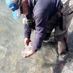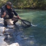 Début septembre, nous étions 5 membres à cette sortie sur le no-kill de la rivière Arc à Termignon. Une belle journée, le soleil était présent et la rivière un peu haute mais avec l'eau cristalline, la carte de l'AAPPMA en poche (Prendre la carte de Termignon) … nous étions presque sûr de passer une des meilleures sorties de l'année. A 8h30, nous nous séparons en deux groupe sur toute la longueur du no-kill. Après 1h30 de pêche, pas une touche, aucun poisson aperçu et j'ai passé les 3/4 de mes modèles de nymphe. Et puis vers 10h30 je m'aperçois que le niveau commençait à baisser légèrement, ce qui est un bon présage. Quelques minutes après, nous avons les premières touches et truites pour Claude et Patrice et vers 11h00 je fais ma première et une seconde dans la foulée et puis